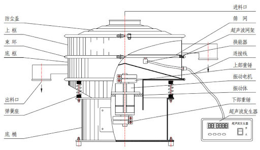 流通式超聲波篩由防塵蓋、進料斗、超聲波振動系統、篩網、出料口、減震底座、電機等組成。超聲波換能器均勻分布于篩網兩側,通過高頻振動快速破除物料粘連,搭配耐磨不銹鋼篩網,實現精細分級。中間層設導流板引導物料流通,底部減震底座采用橡膠減震墊,減少運行噪音與設備損耗。